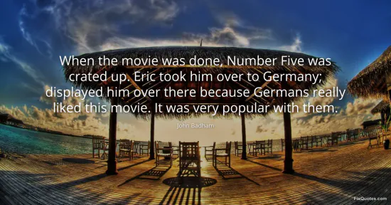 Badham, John. "When the movie was done, Number Five was crated up. Eric took him over to Germany; displayed him over there because Germans really liked this movie. It was very popular with them." FixQuotes. January 18, 2026. https://fixquotes.com/quotes/when-the-movie-was-done-number-five-was-crated-up-17613/.