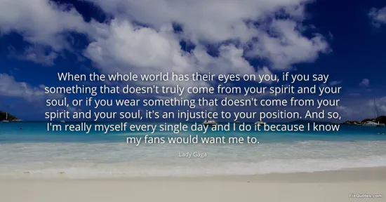 Gaga, Lady. (2026, January 17). When the whole world has their eyes on you, if you say something that doesn't truly come from your spirit and your soul, or if you wear something that doesn't come from your spirit and your soul, it's an injustice to your position. And so, I'm really myself every single day and I do it because I know my fans would want me to. FixQuotes. https://fixquotes.com/quotes/when-the-whole-world-has-their-eyes-on-you-if-you-41611/