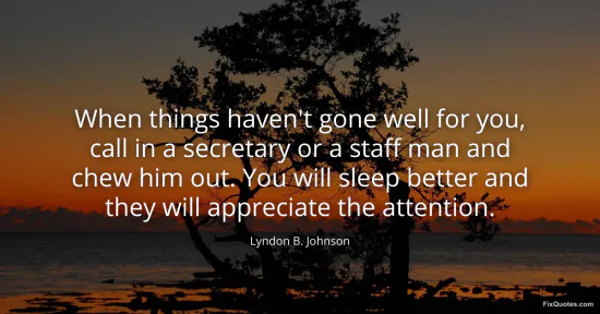 Johnson, Lyndon B. "When things haven't gone well for you, call in a secretary or a staff man and chew him out. You will sleep better and they will appreciate the attention." FixQuotes. January 17, 2026. https://fixquotes.com/quotes/when-things-havent-gone-well-for-you-call-in-a-8771/.
