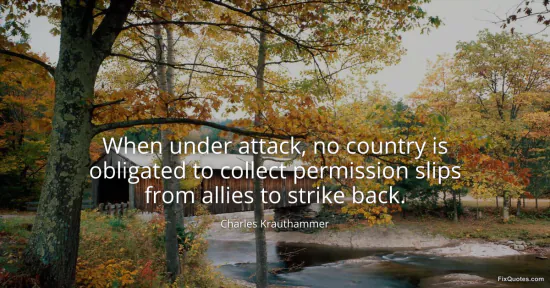 Krauthammer, Charles. "When under attack, no country is obligated to collect permission slips from allies to strike back." FixQuotes. January 15, 2026. https://fixquotes.com/quotes/when-under-attack-no-country-is-obligated-to-141600/.