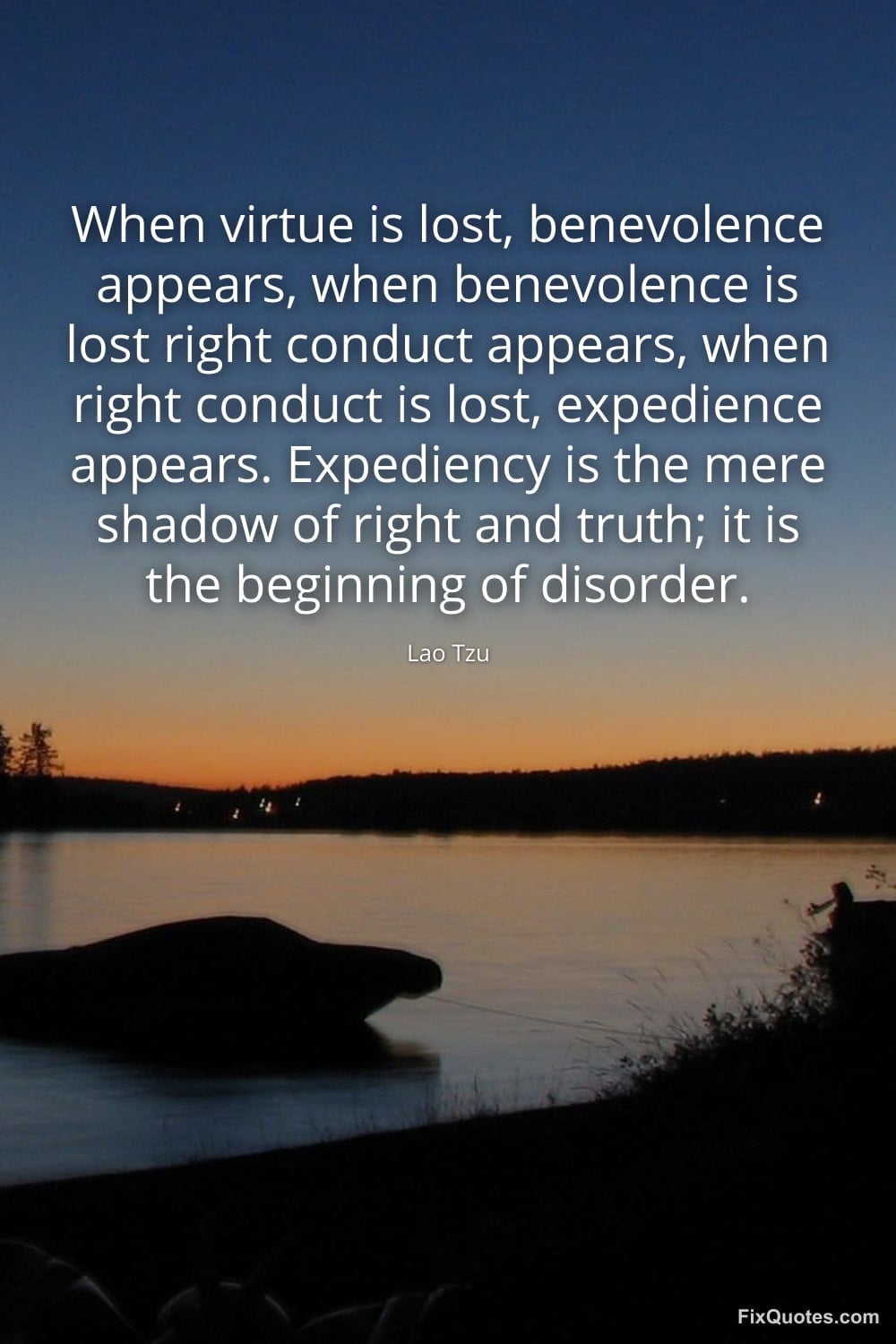 "When virtue is lost, benevolence appears, when benevolence is lost right conduct appears, when right conduct is lost, expedience appears. Expediency is the mere shadow of right and truth; it is the beginning of disorder"