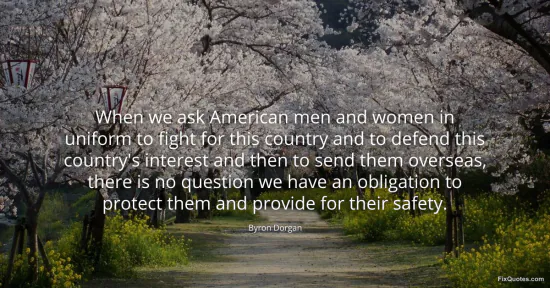 Dorgan, Byron. (2026, January 15). When we ask American men and women in uniform to fight for this country and to defend this country's interest and then to send them overseas, there is no question we have an obligation to protect them and provide for their safety. FixQuotes. https://fixquotes.com/quotes/when-we-ask-american-men-and-women-in-uniform-to-142306/