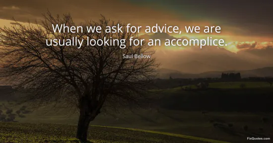 Bellow, Saul. (2026, January 18). When we ask for advice, we are usually looking for an accomplice. FixQuotes. https://fixquotes.com/quotes/when-we-ask-for-advice-we-are-usually-looking-for-21148/