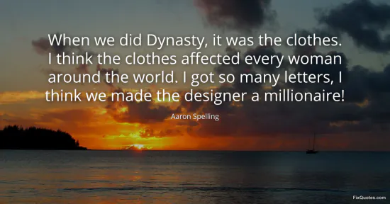 Spelling, Aaron. "When we did Dynasty, it was the clothes. I think the clothes affected every woman around the world. I got so many letters, I think we made the designer a millionaire!" FixQuotes. January 17, 2026. https://fixquotes.com/quotes/when-we-did-dynasty-it-was-the-clothes-i-think-39999/.