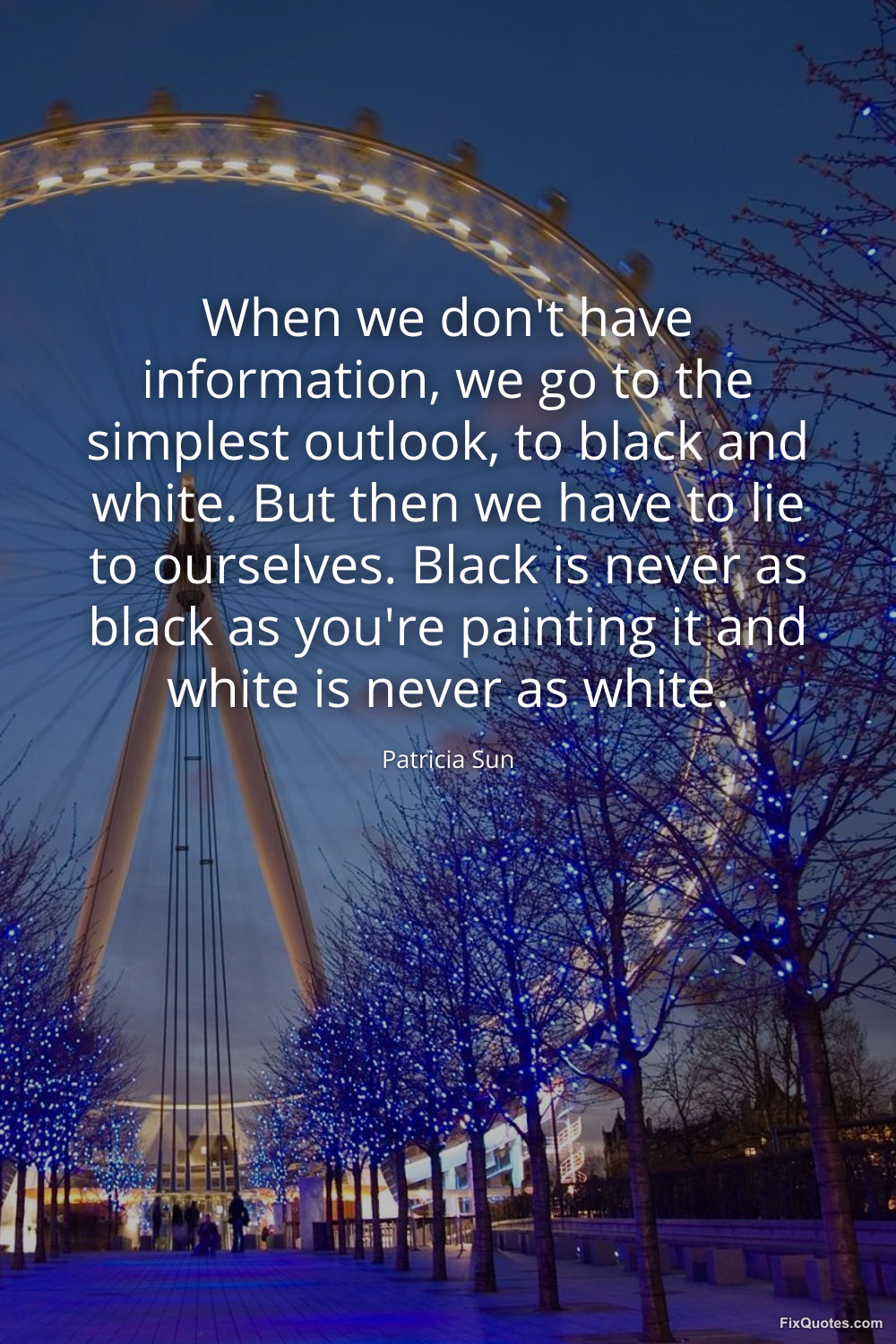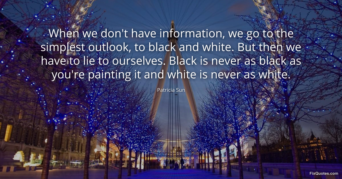 Sun, Patricia. (2026, January 15). When we don't have information, we go to the simplest outlook, to black and white. But then we have to lie to ourselves. Black is never as black as you're painting it and white is never as white. FixQuotes. https://fixquotes.com/quotes/when-we-dont-have-information-we-go-to-the-153967/