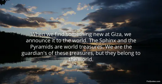 "When we find something new at Giza, we announce it to the world. The Sphinx and the Pyramids are world treasures. We are the guardian's of these treasures, but they belong to the world." FixQuotes, 15 Jan. 2026, https://fixquotes.com/quotes/when-we-find-something-new-at-giza-we-announce-it-165187/. Accessed 12 Feb. 2026.