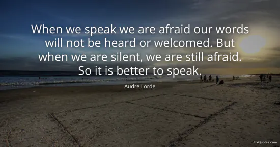 Lorde, Audre. "When we speak we are afraid our words will not be heard or welcomed. But when we are silent, we are still afraid. So it is better to speak." FixQuotes. February 11, 2026. https://fixquotes.com/quotes/when-we-speak-we-are-afraid-our-words-will-not-be-37623/.