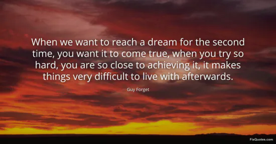 Forget, Guy. "When we want to reach a dream for the second time, you want it to come true, when you try so hard, you are so close to achieving it, it makes things very difficult to live with afterwards." FixQuotes. January 15, 2026. https://fixquotes.com/quotes/when-we-want-to-reach-a-dream-for-the-second-time-167544/.