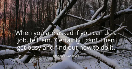 Roosevelt, Theodore. (2026, January 14). When you are asked if you can do a job, tell 'em, 'Certainly I can!' Then get busy and find out how to do it. FixQuotes. https://fixquotes.com/quotes/when-you-are-asked-if-you-can-do-a-job-tell-em-83483/