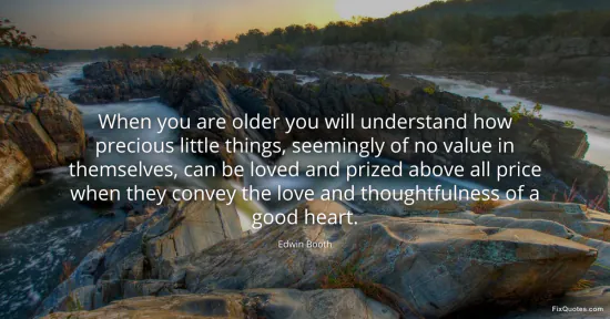 Booth, Edwin. "When you are older you will understand how precious little things, seemingly of no value in themselves, can be loved and prized above all price when they convey the love and thoughtfulness of a good heart." FixQuotes. January 16, 2026. https://fixquotes.com/quotes/when-you-are-older-you-will-understand-how-135046/.