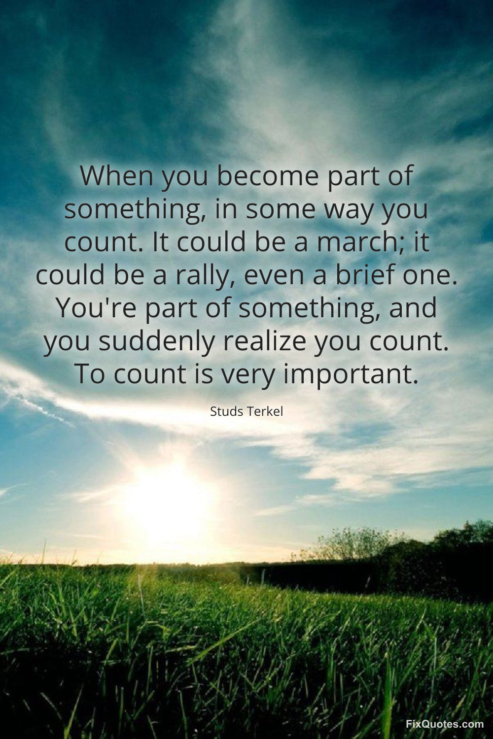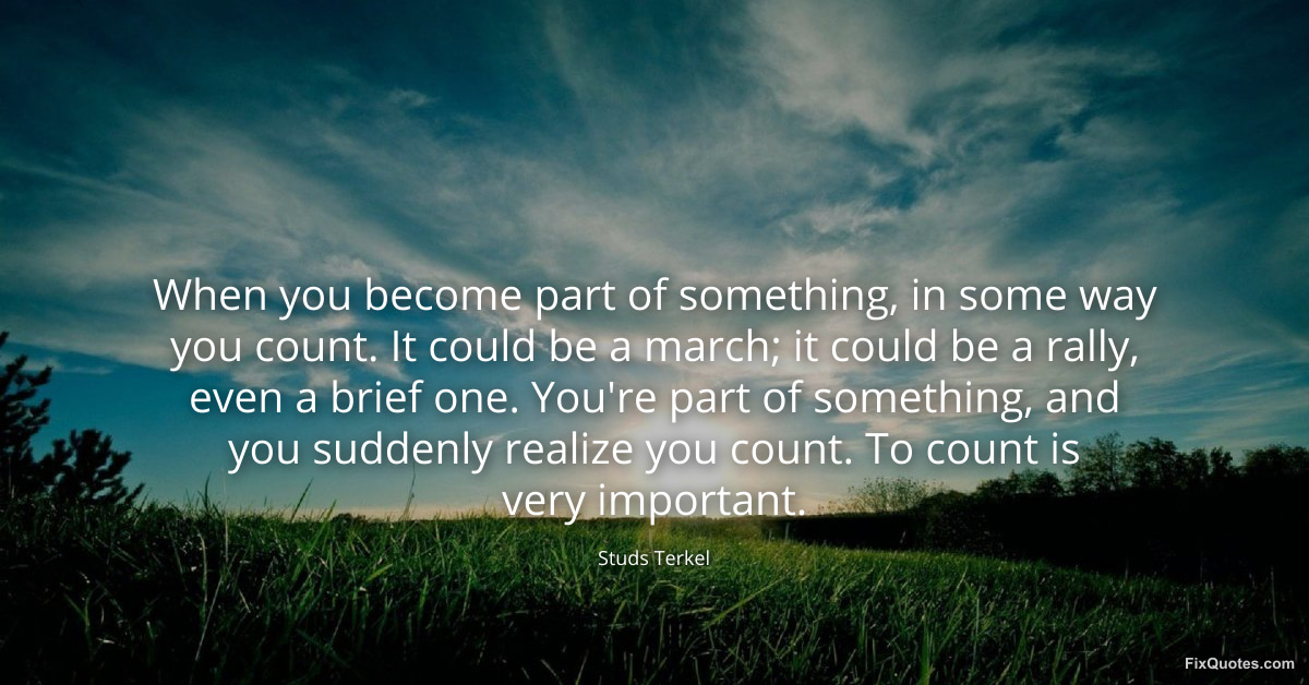Terkel, Studs. (2026, January 16). When you become part of something, in some way you count. It could be a march; it could be a rally, even a brief one. You're part of something, and you suddenly realize you count. To count is very important. FixQuotes. https://fixquotes.com/quotes/when-you-become-part-of-something-in-some-way-you-123691/