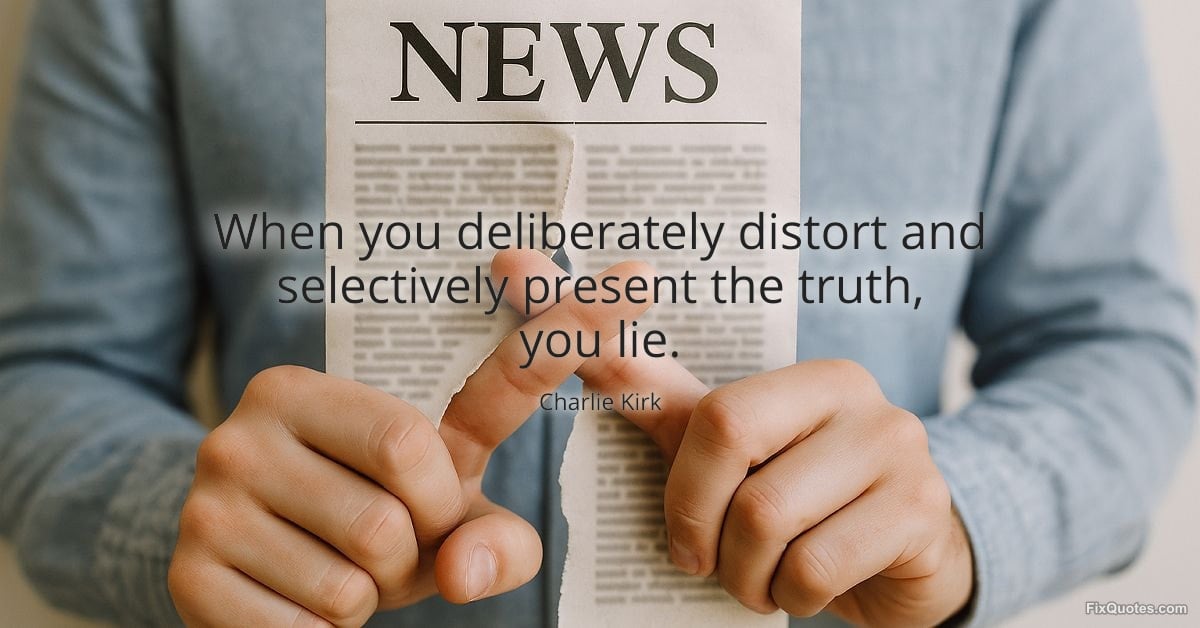 Kirk, Charlie. "When you deliberately distort and selectively present the truth, you lie." FixQuotes. January 13, 2026. https://fixquotes.com/quotes/when-you-deliberately-distort-and-selectively-173182/.