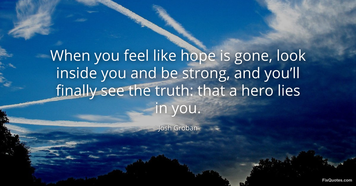 Groban, Josh. "When you feel like hope is gone, look inside you and be strong, and you’ll finally see the truth: that a hero lies in you." FixQuotes. January 30, 2026. https://fixquotes.com/quotes/when-you-feel-like-hope-is-gone-look-inside-you-184643/.