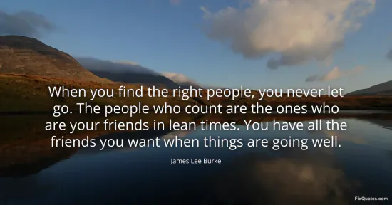 Burke, James Lee. "When you find the right people, you never let go. The people who count are the ones who are your friends in lean times. You have all the friends you want when things are going well." FixQuotes. January 17, 2026. https://fixquotes.com/quotes/when-you-find-the-right-people-you-never-let-go-46795/.