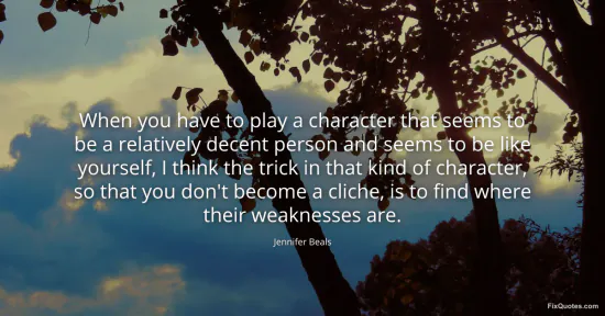 Beals, Jennifer. (2026, January 17). When you have to play a character that seems to be a relatively decent person and seems to be like yourself, I think the trick in that kind of character, so that you don't become a cliche, is to find where their weaknesses are. FixQuotes. https://fixquotes.com/quotes/when-you-have-to-play-a-character-that-seems-to-68989/