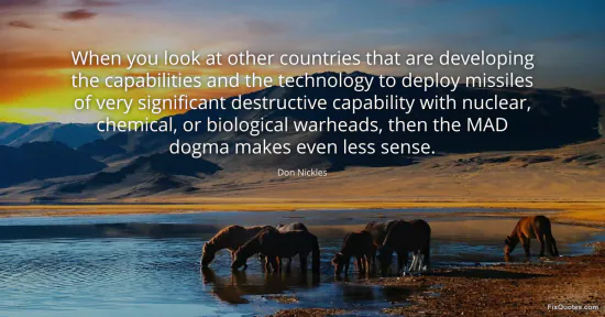 Nickles, Don. "When you look at other countries that are developing the capabilities and the technology to deploy missiles of very significant destructive capability with nuclear, chemical, or biological warheads, then the MAD dogma makes even less sense." FixQuotes. January 17, 2026. https://fixquotes.com/quotes/when-you-look-at-other-countries-that-are-81895/.