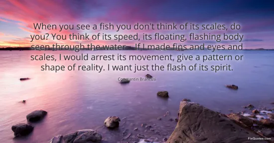 Brancusi, Constantin. (2026, January 17). When you see a fish you don't think of its scales, do you? You think of its speed, its floating, flashing body seen through the water... If I made fins and eyes and scales, I would arrest its movement, give a pattern or shape of reality. I want just the flash of its spirit. FixQuotes. https://fixquotes.com/quotes/when-you-see-a-fish-you-dont-think-of-its-scales-42530/