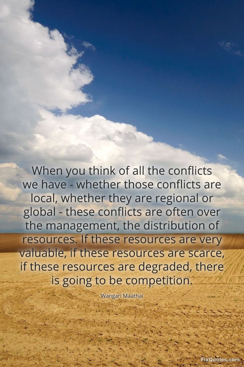 Maathai, Wangari. (2026, February 18). When you think of all the conflicts we have - whether those conflicts are local, whether they are regional or global - these conflicts are often over the management, the distribution of resources. If these resources are very valuable, if these resources are scarce, if these resources are degraded, there is going to be competition. FixQuotes. https://fixquotes.com/quotes/when-you-think-of-all-the-conflicts-we-have-66214/