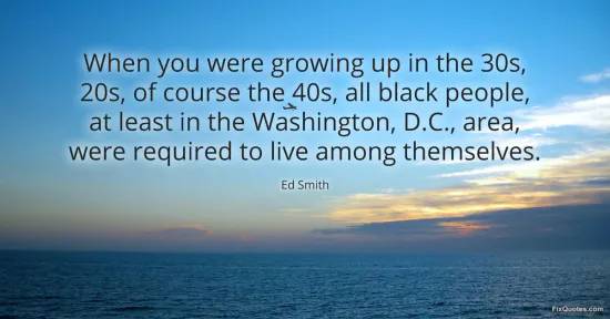 Smith, Ed. "When you were growing up in the 30s, 20s, of course the 40s, all black people, at least in the Washington, D.C., area, were required to live among themselves." FixQuotes. February 16, 2026. https://fixquotes.com/quotes/when-you-were-growing-up-in-the-30s-20s-of-course-140595/.