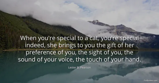 Pearson, Lester B. (2026, January 17). When you're special to a cat, you're special indeed, she brings to you the gift of her preference of you, the sight of you, the sound of your voice, the touch of your hand. FixQuotes. https://fixquotes.com/quotes/when-youre-special-to-a-cat-youre-special-indeed-69992/