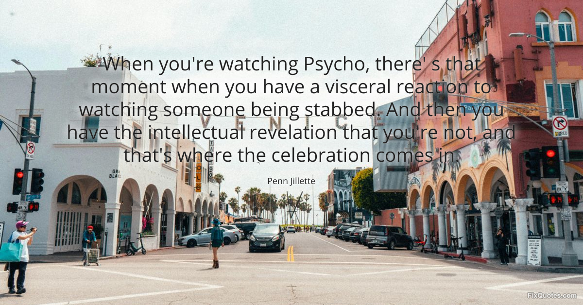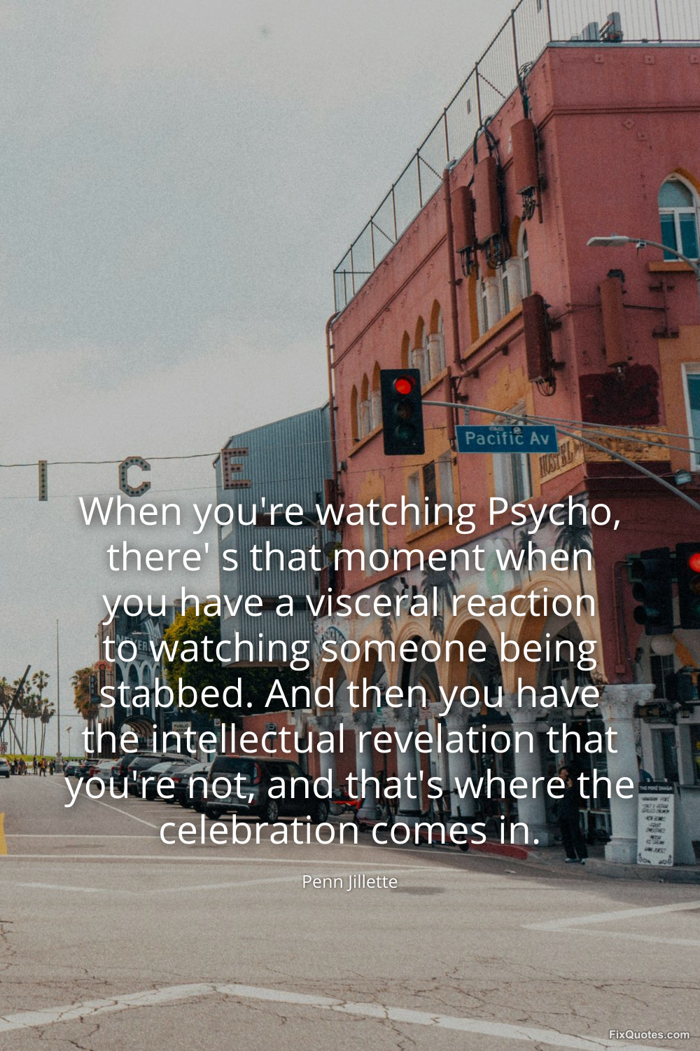 Jillette, Penn. "When you're watching Psycho, there' s that moment when you have a visceral reaction to watching someone being stabbed. And then you have the intellectual revelation that you're not, and that's where the celebration comes in." FixQuotes. January 16, 2026. https://fixquotes.com/quotes/when-youre-watching-psycho-there-s-that-moment-130411/.