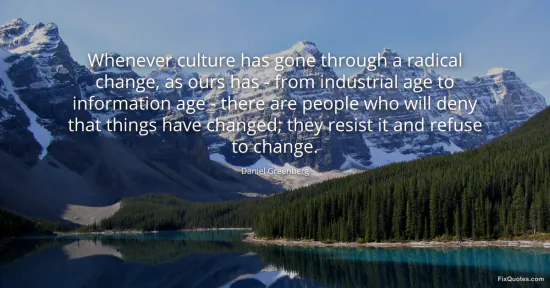 Greenberg, Daniel. "Whenever culture has gone through a radical change, as ours has - from industrial age to information age - there are people who will deny that things have changed; they resist it and refuse to change." FixQuotes. January 17, 2026. https://fixquotes.com/quotes/whenever-culture-has-gone-through-a-radical-38132/.