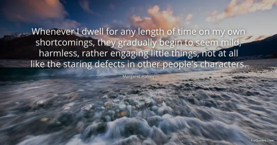 Halsey, Margaret. "Whenever I dwell for any length of time on my own shortcomings, they gradually begin to seem mild, harmless, rather engaging little things, not at all like the staring defects in other people's characters." FixQuotes. January 16, 2026. https://fixquotes.com/quotes/whenever-i-dwell-for-any-length-of-time-on-my-own-127671/.