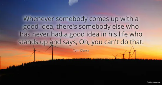 Clancy, Tom. "Whenever somebody comes up with a good idea, there's somebody else who has never had a good idea in his life who stands up and says, Oh, you can't do that." FixQuotes. January 16, 2026. https://fixquotes.com/quotes/whenever-somebody-comes-up-with-a-good-idea-117138/.