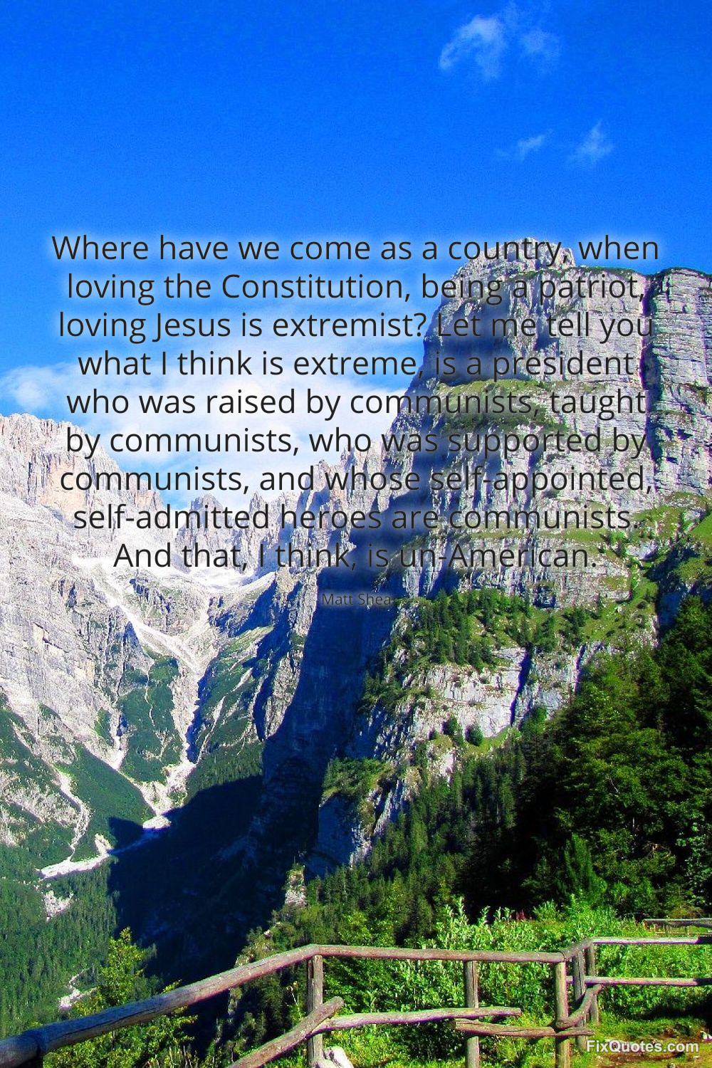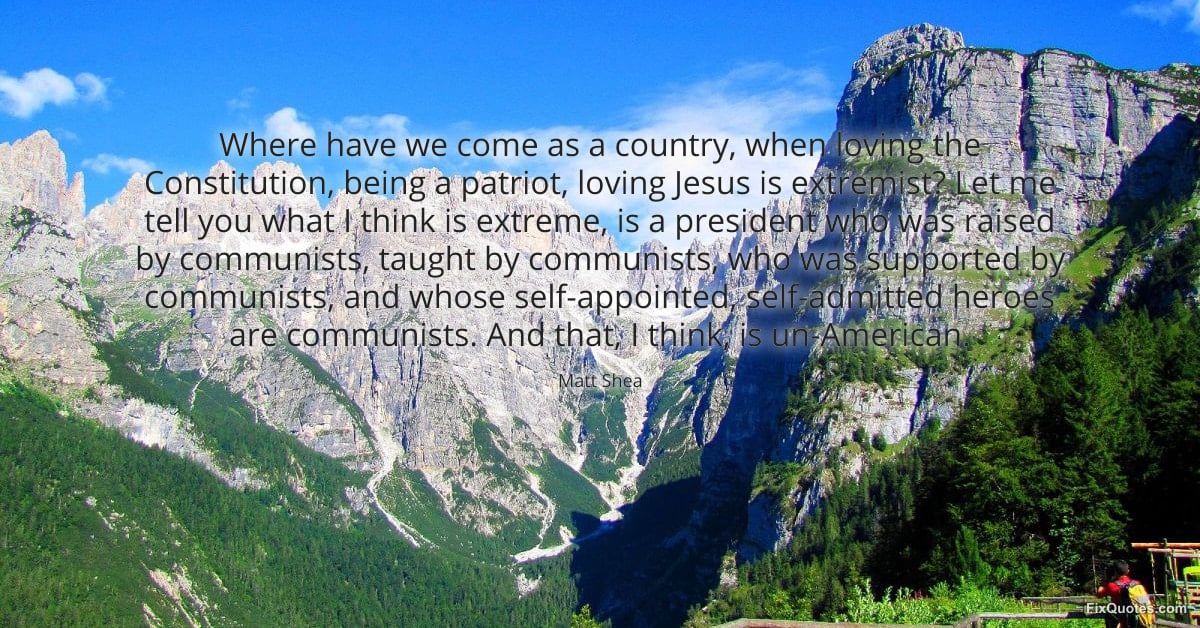 Shea, Matt. "Where have we come as a country, when loving the Constitution, being a patriot, loving Jesus is extremist? Let me tell you what I think is extreme, is a president who was raised by communists, taught by communists, who was supported by communists, and whose self-appointed, self-admitted heroes are communists. And that, I think, is un-American." FixQuotes. February 9, 2026. https://fixquotes.com/quotes/where-have-we-come-as-a-country-when-loving-the-184991/.