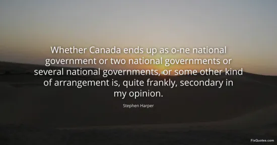 Harper, Stephen. "Whether Canada ends up as o-ne national government or two national governments or several national governments, or some other kind of arrangement is, quite frankly, secondary in my opinion." FixQuotes. January 16, 2026. https://fixquotes.com/quotes/whether-canada-ends-up-as-o-ne-national-131023/.