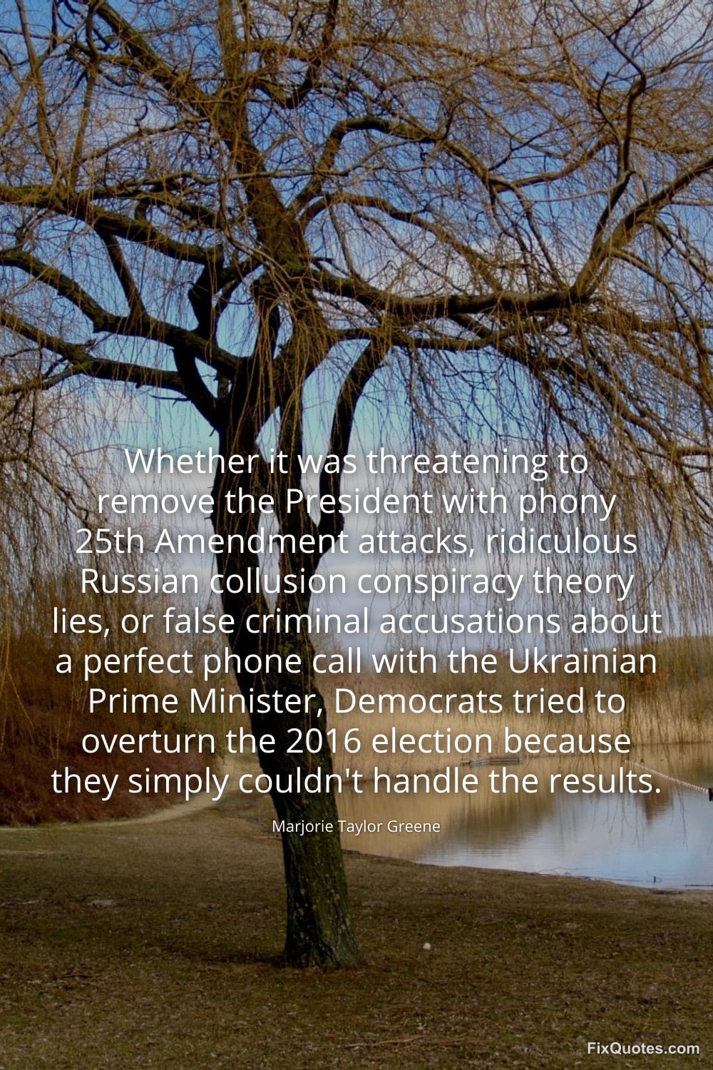 Greene, Marjorie Taylor. (2026, January 15). Whether it was threatening to remove the President with phony 25th Amendment attacks, ridiculous Russian collusion conspiracy theory lies, or false criminal accusations about a perfect phone call with the Ukrainian Prime Minister, Democrats tried to overturn the 2016 election because they simply couldn't handle the results. FixQuotes. https://fixquotes.com/quotes/whether-it-was-threatening-to-remove-the-173548/