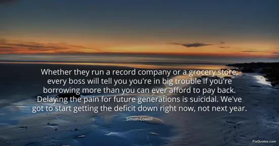 Cowell, Simon. "Whether they run a record company or a grocery store, every boss will tell you you're in big trouble if you're borrowing more than you can ever afford to pay back. Delaying the pain for future generations is suicidal. We've got to start getting the deficit down right now, not next year." FixQuotes. January 17, 2026. https://fixquotes.com/quotes/whether-they-run-a-record-company-or-a-grocery-77345/.