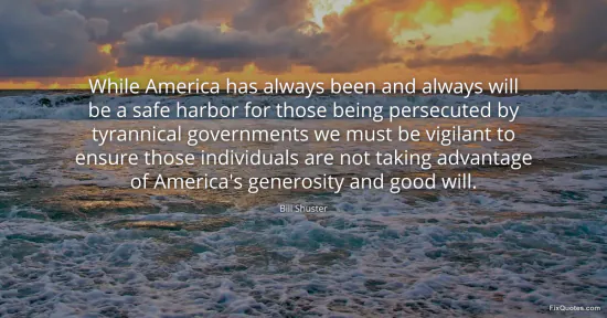 Shuster, Bill. "While America has always been and always will be a safe harbor for those being persecuted by tyrannical governments we must be vigilant to ensure those individuals are not taking advantage of America's generosity and good will." FixQuotes. January 17, 2026. https://fixquotes.com/quotes/while-america-has-always-been-and-always-will-be-41195/.