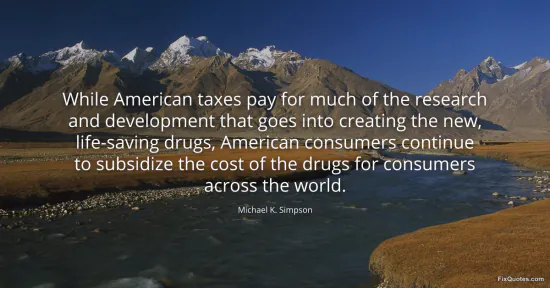 Simpson, Michael K. "While American taxes pay for much of the research and development that goes into creating the new, life-saving drugs, American consumers continue to subsidize the cost of the drugs for consumers across the world." FixQuotes. January 17, 2026. https://fixquotes.com/quotes/while-american-taxes-pay-for-much-of-the-research-74782/.