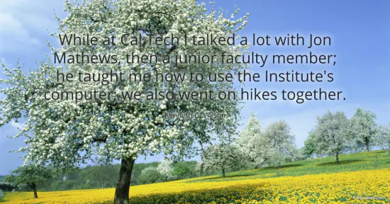 Wilson, Kenneth G. "While at Cal Tech I talked a lot with Jon Mathews, then a junior faculty member; he taught me how to use the Institute's computer; we also went on hikes together." FixQuotes. January 16, 2026. https://fixquotes.com/quotes/while-at-cal-tech-i-talked-a-lot-with-jon-mathews-133770/.