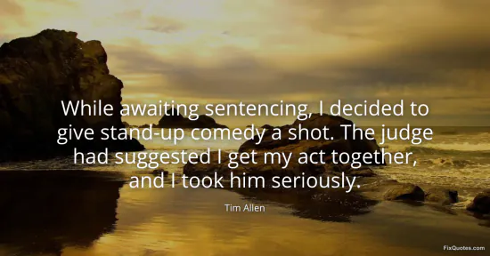 Allen, Tim. "While awaiting sentencing, I decided to give stand-up comedy a shot. The judge had suggested I get my act together, and I took him seriously." FixQuotes. January 16, 2026. https://fixquotes.com/quotes/while-awaiting-sentencing-i-decided-to-give-107426/.