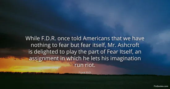 Rich, Frank. "While F.D.R. once told Americans that we have nothing to fear but fear itself, Mr. Ashcroft is delighted to play the part of Fear Itself, an assignment in which he lets his imagination run riot." FixQuotes. January 17, 2026. https://fixquotes.com/quotes/while-fdr-once-told-americans-that-we-have-51680/.