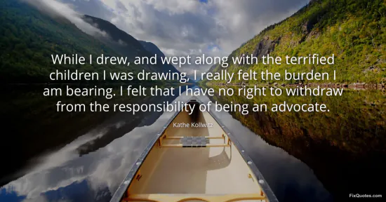 Kollwitz, Kathe. "While I drew, and wept along with the terrified children I was drawing, I really felt the burden I am bearing. I felt that I have no right to withdraw from the responsibility of being an advocate." FixQuotes. January 17, 2026. https://fixquotes.com/quotes/while-i-drew-and-wept-along-with-the-terrified-63847/.