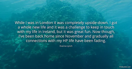 Celebrity is usually sold as a permanent upgrade; Evanna Lynch frames it as a temporary, disorienting lease. “Completely upside-down” isn’t just jet lag or a busy schedule. It’s the psychological inversion that happens when your private self becomes an accessory to a public franchise. London stands in for the machine: press, sets, schedules, instant recognition, and a version of you that other people feel oddly entitled to. The line “I got a whole new life” carries the thrill of escape, but also the cost: a “challenge” to keep in touch with Ireland, not because she forgot where she’s from, but because fame rearranges your calendar, your friendships, even what counts as a normal day.