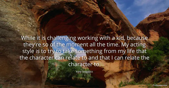 Sedgwick, Kyra. "While it is challenging working with a kid, because they're so of the moment all the time. My acting style is to try to take something from my life that the character can relate to and that I can relate the character to." FixQuotes. January 17, 2026. https://fixquotes.com/quotes/while-it-is-challenging-working-with-a-kid-64360/.