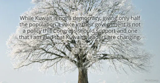 "While Kuwait is not a democracy, giving only half the population a voice in their government is not a policy this Congress should support and one that I am glad that Kuwait's leaders are changing." FixQuotes, 17 Jan. 2026, https://fixquotes.com/quotes/while-kuwait-is-not-a-democracy-giving-only-half-53834/. Accessed 13 Feb. 2026.