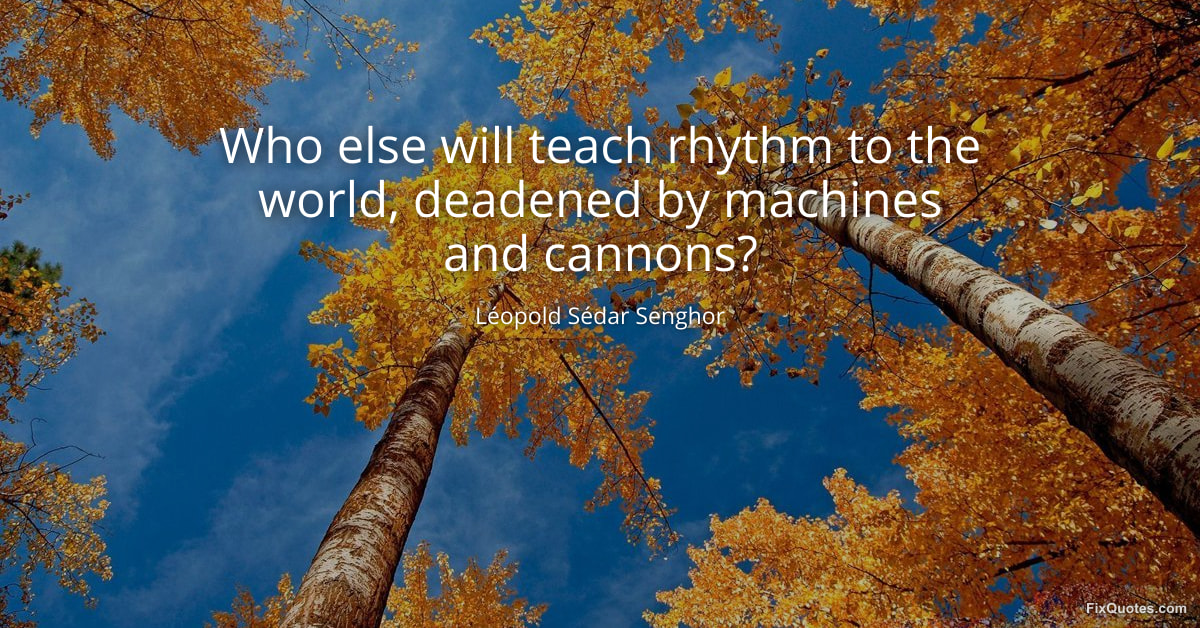 Senghor, Léopold Sédar. (2026, February 16). Who else will teach rhythm to the world, deadened by machines and cannons? FixQuotes. https://fixquotes.com/quotes/who-else-will-teach-rhythm-to-the-world-deadened-185497/