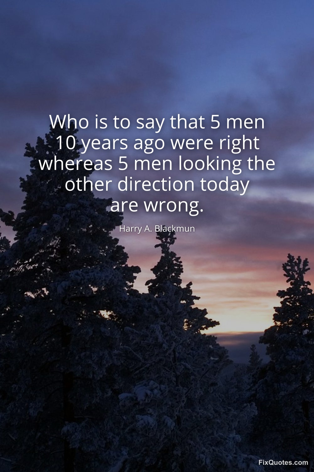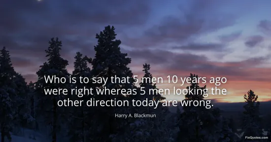 Blackmun, Harry A. "Who is to say that 5 men 10 years ago were right whereas 5 men looking the other direction today are wrong." FixQuotes. January 17, 2026. https://fixquotes.com/quotes/who-is-to-say-that-5-men-10-years-ago-were-right-43606/.