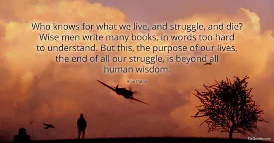 Paton, Alan. (2026, January 17). Who knows for what we live, and struggle, and die? Wise men write many books, in words too hard to understand. But this, the purpose of our lives, the end of all our struggle, is beyond all human wisdom. FixQuotes. https://fixquotes.com/quotes/who-knows-for-what-we-live-and-struggle-and-die-71597/