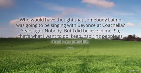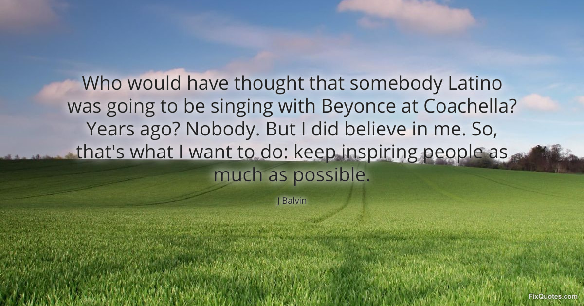 Balvin, J. (2026, February 4). Who would have thought that somebody Latino was going to be singing with Beyonce at Coachella? Years ago? Nobody. But I did believe in me. So, that's what I want to do: keep inspiring people as much as possible. FixQuotes. https://fixquotes.com/quotes/who-would-have-thought-that-somebody-latino-was-184904/