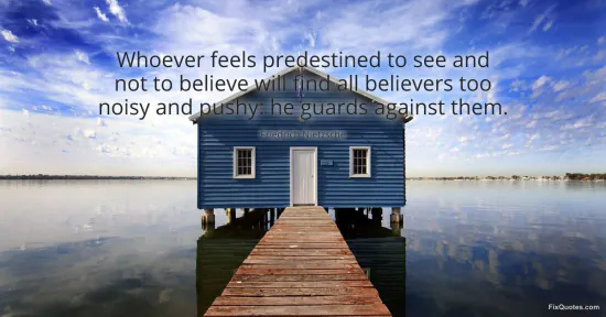"Whoever feels predestined to see and not to believe will find all believers too noisy and pushy: he guards against them." FixQuotes, 15 Jan. 2026, https://fixquotes.com/quotes/whoever-feels-predestined-to-see-and-not-to-328/. Accessed 22 Feb. 2026.