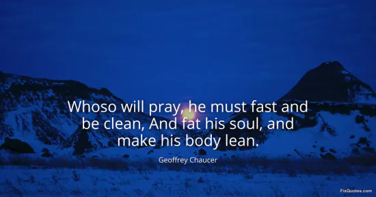 Chaucer, Geoffrey. (2026, January 16). Whoso will pray, he must fast and be clean, And fat his soul, and make his body lean. FixQuotes. https://fixquotes.com/quotes/whoso-will-pray-he-must-fast-and-be-clean-and-fat-112162/