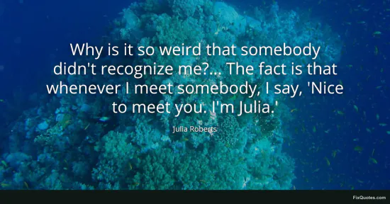 "Why is it so weird that somebody didn't recognize me?... The fact is that whenever I meet somebody, I say, 'Nice to meet you. I'm Julia.'." FixQuotes, 15 Jan. 2026, https://fixquotes.com/quotes/why-is-it-so-weird-that-somebody-didnt-recognize-166084/. Accessed 12 Feb. 2026.