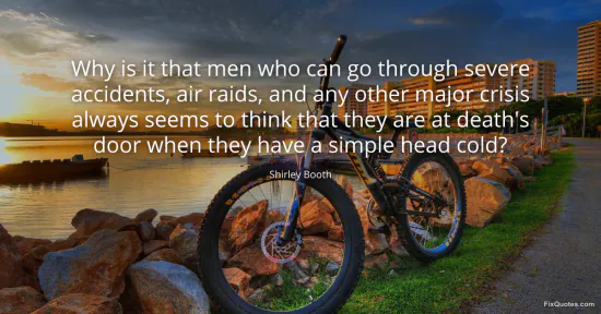 Booth, Shirley. "Why is it that men who can go through severe accidents, air raids, and any other major crisis always seems to think that they are at death's door when they have a simple head cold?" FixQuotes. January 16, 2026. https://fixquotes.com/quotes/why-is-it-that-men-who-can-go-through-severe-123555/.