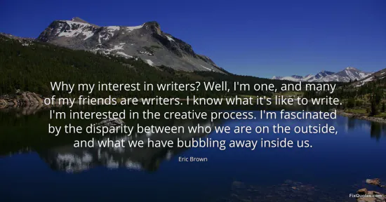 Brown, Eric. "Why my interest in writers? Well, I'm one, and many of my friends are writers. I know what it's like to write. I'm interested in the creative process. I'm fascinated by the disparity between who we are on the outside, and what we have bubbling away inside us." FixQuotes. January 16, 2026. https://fixquotes.com/quotes/why-my-interest-in-writers-well-im-one-and-many-136025/.